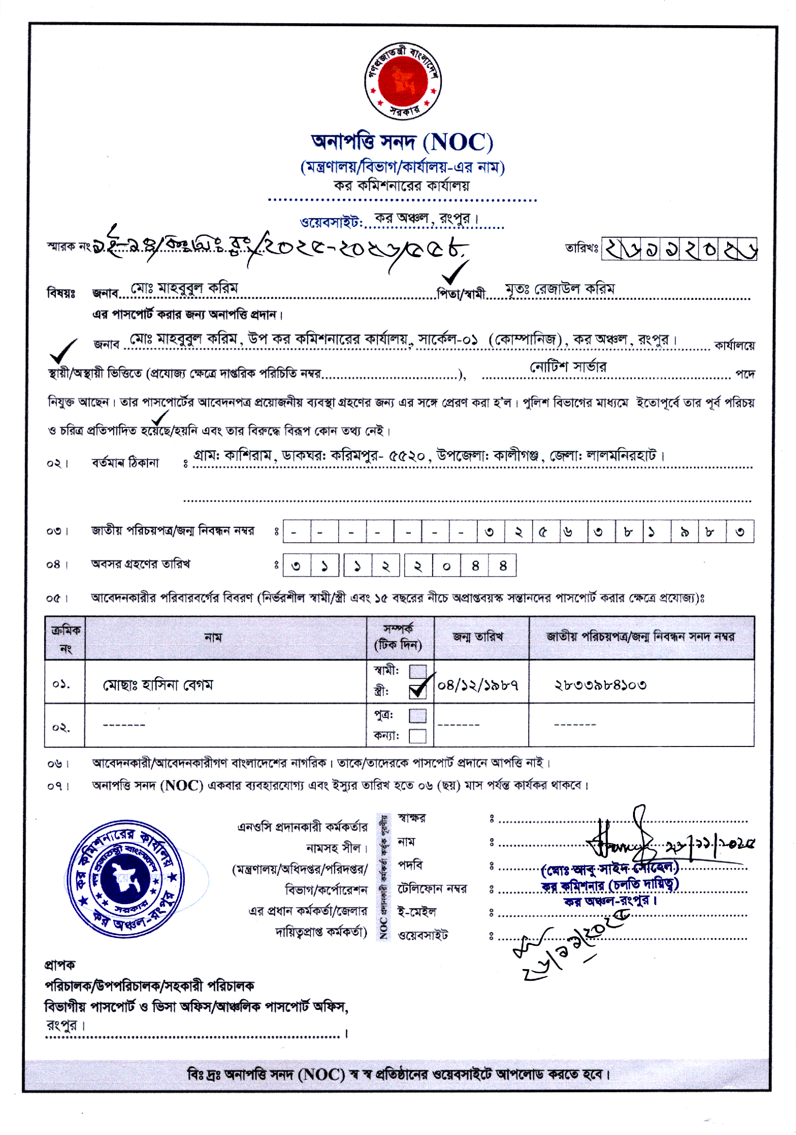 • জনাব মোঃ রুহুল ইসলাম, কর পরিদর্শক এর আন্তর্জাতিক পাসপোর্টের অনাপত্তি সনদ।